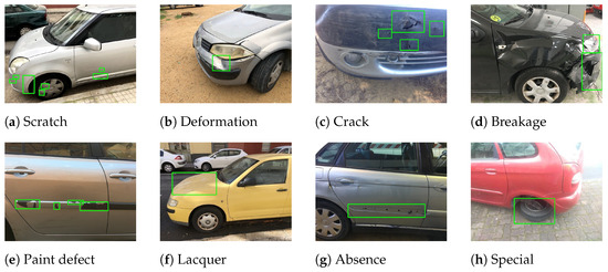 This dataset consists of 7896 images of vehicles with damage and 2464 images of vehicles without damage. The damage has been divided into eight types: scratches, deformations, breakage—crack, breakage—loss of material, paint defect—peeling, paint defect—lacquering, missing part, and special damage.