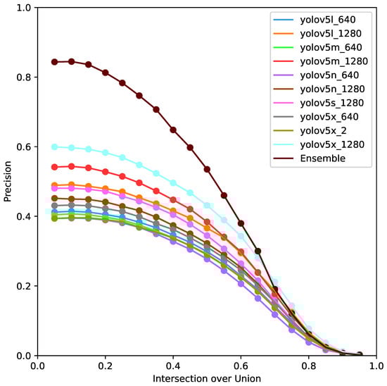 In our approach, we will use an ensemble of 10 YOLOv5 models to achieve a high-precision model [23]. YOLOv8 gives us lower performance compared to YOLOv5, so we chose YOLOv5 as our base detector. Our intuition about the better performance of YOLOv5 with respect to YOLOv8 is that the former is better adapted to real scenarios. This has been shown in the literature [24,25], where YOLOv5 outperforms YOLOv8 in terms of recall in particular cases and additionally generates higher reliability by having a low standard deviation. However, we extend the use of our ensemble to YOLOv8 models for the purpose of comparing the performance of more recent models.