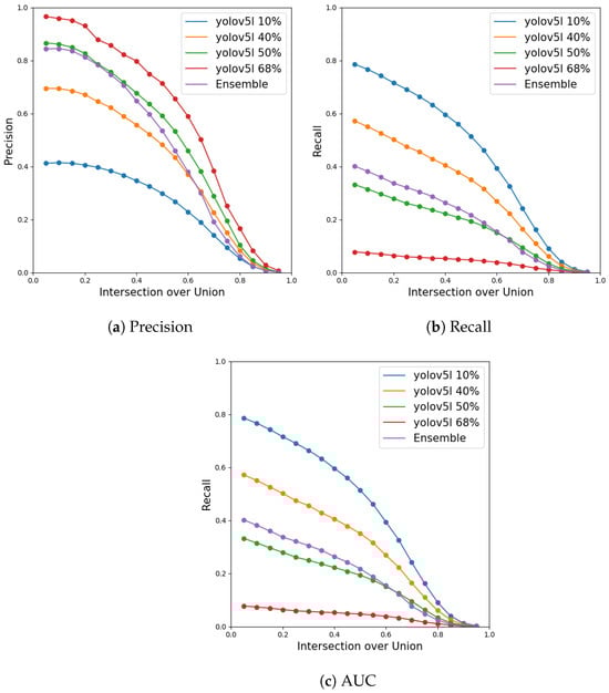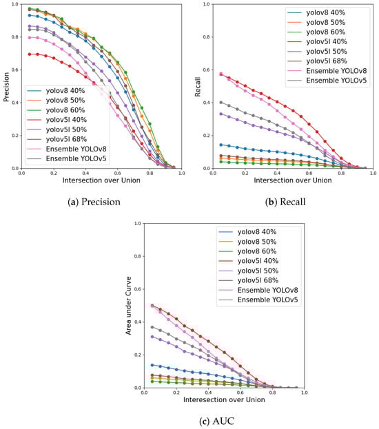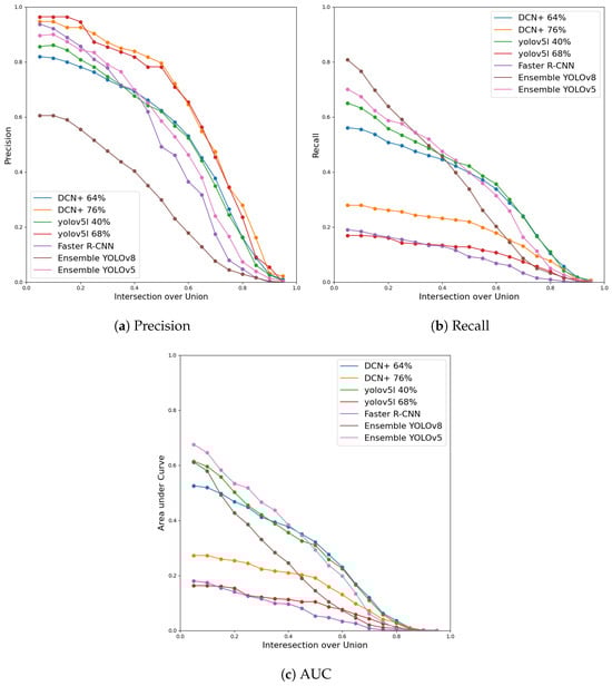 Ensemble vs. others models. This figure is complemented by the data in Table 4. The more balanced DCN+ (64%) has a high false positive rate (30%), and the DCN+ inference time is more than 4 times slower than our ensemble. The faster R-CNN ensemble achieves a good result in the precision metric but is outperformed by the other models in the recall and AUC metrics. The YOLOv8 ensemble excels in the recall and AUC metrics, followed by the YOLOv5 ensemble, which performs better in terms of precision.