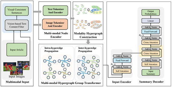Capturing these complex, fine-grained cross-modal interactions to facilitate multimodal summarization within a single framework is a challenging endeavor. A prevalent strategy involves representing the informative elements of multimodal data as nodes within a graph, with their interactions depicted as edges [8,9]. Graph neural networks (GNNs) are then utilized to merge this cross-domain information. However, traditional GNNs often fall short in capturing higher-order features, as they primarily concentrate on node aggregation and may overlook the rich information contained within the connecting edges. Furthermore, GNNs typically employ a one-to-one mapping mechanism, which complicates the modeling of intricate data correlations that require subtle information integration, such as the relationships between textual phrases or between patches and objects within images. In such contexts, connecting distant nodes often necessitates multiple hops, relying on multi-layer aggregation within GNNs. Unfortunately, challenges such as oversmoothing and the introduction of noise—particularly in deep GNN architectures—can significantly diminish the model’s overall efficacy [10,11].