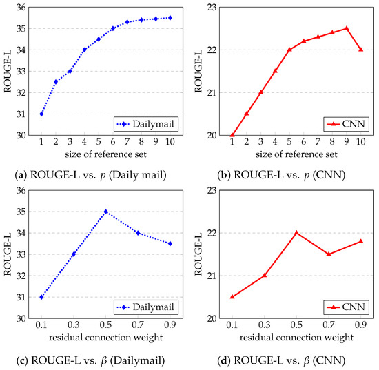 In this section, we conduct a sensitivity analysis of HGTMFS with respect to two pivotal hyperparameters: the size p of reference set in Section 4.4.1 and the residual connection weight in Equation (5). Figure 2a,b delineate the performance trends as functions of p. The results illustrate that HGTMFS’s performance initially exhibits a marked improvement and subsequently stabilizes as p increases. This behavior suggests that a larger reference set facilitates the capture of more comprehensive semantic information, thereby enhancing the model’s ability to generate accurate summaries.