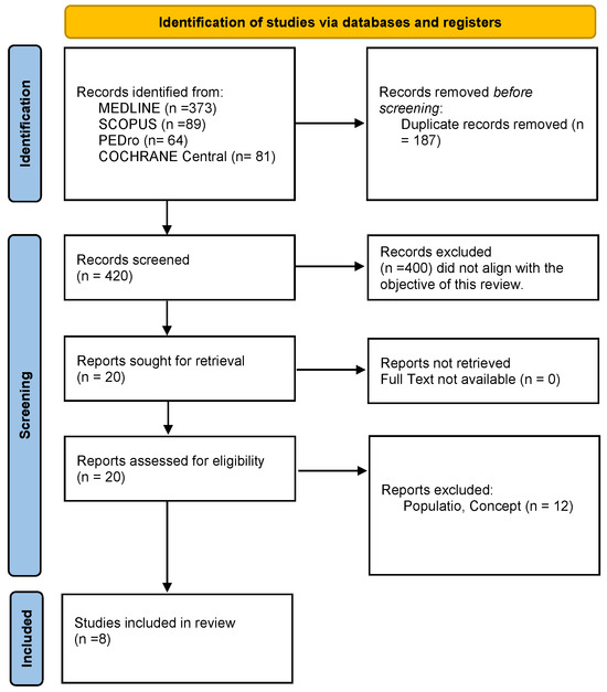 The flowchart of article selection is presented in Figure 1. A total of 607 records were initially identified through bibliographic searches across different databases: MEDLINE (373 records), Scopus (89 records), PEDro (64 records), Cochrane central (81 records), and grey literature. After removing 187 duplicates using an automated reference management tool, a manual check was performed to ensure no additional duplicates remained. Duplicates were identified based on matching titles, authors, publication years, and DOIs. Articles that appeared multiple times due to being indexed in different databases were consolidated, retaining only the most complete version. The exclusion criteria also included studies that were not peer-reviewed, lacked full-text availability, or did not focus on the relationship between pelvic tilt, femoral torsion, and hip biomechanics. This comprehensive approach to managing duplicates ensured a streamlined dataset for further screening. Of these, 20 were screened based on titles and abstracts, and 12 were excluded for not meeting the inclusion criteria or because they did not align with the objective of this review. The full texts of eight reports were assessed for eligibility. Eight studies were finally included in the review (Table 1). The quality of the studies was assessed with the MINORS scale (Table 2).