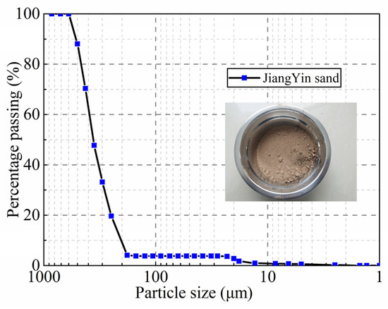 The particle size of the sand is mainly distributed between 0.2 mm and 1.0 mm (D50 = 0.362 mm), which is a medium sand soil. The specific gravity of the soil particle is 2.60, and the maximum dry density is 1.78 g/cm3, and the minimum dry density is 1.44 g/cm3. The relative density of the sand sample is 0.5 by layered compaction.