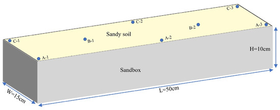 The sandbox model adopted in this test is 50 cm × 15 cm × 10 cm (inner diameter 48.8 cm × 13.8 cm × 9.4 cm), as shown in Figure 2. According to the site sand density of 0.90, the sand is piled into the test sandbox model. The amount of soil is 48.8 × 13.8 × 9.4 × 1.686 = 10.673 kg.