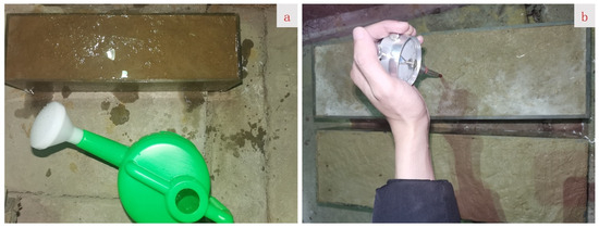 Penetration test of microbially reinforced sand. (a) Spraying microbial slurry; (b) Measure penetration resistance.