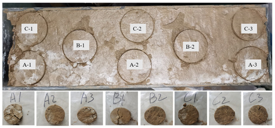 Within thirty minutes following the completion of the final reinforcement phase, the penetration resistance of sand samples collected from both the perimeter of the sandbox and eight designated test points in the center was evaluated. Following the flume testing, cemented sand adjacent to each test point was extracted using a ring knife; subsequently, the thickness of the hardened shell was measured, and calcium carbonate content was determined through a pickling method. The arrangement of test points and variations in sample materials are depicted in Figure 4.