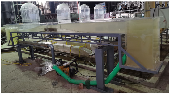 Water scours the surface of the sandbox, inducing localized shear stress. When this shear stress exceeds a critical threshold, scour occurs, resulting in particle displacement. Any minor initial breach constitutes a vulnerable point where shear stress is elevated relative to its surroundings, facilitating rapid progression into a substantial gap. A water tank experiment was performed on surface samples of the sand model post MICP spray treatment. A constant pressure variable frequency pump was utilized to control water volume, with flow velocity being systematically increased. The mass of load and suspended material collected at varying flow rates was recorded, allowing for the calculation of the relationship between erosion rate and shear stress in the microbial cemented sand model subjected to washing within the water tank, as depicted in Figure 9 and Figure 10.