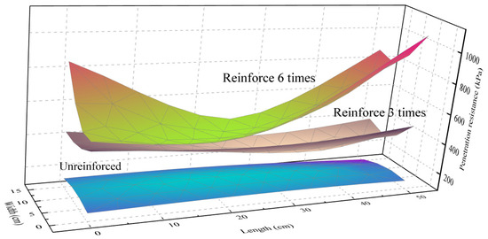 Spatial distribution characteristics of penetration resistance in sand models with different reinforcement degrees.
