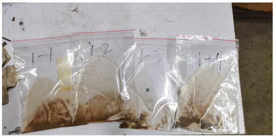 To accurately represent the degree of sample erosion, it is essential to calculate both the starting load mass and the suspended mass as measurement values, collectively defined as erosion mass (M). For each flow rate group, upstream water was collected using a plastic hose; this volume is denoted as . The net mass of the sample within this volume was determined through suction filtration, yielding . The bed load collected over intervals of 1~2 min and 2~3 min via funnel corresponds to , while the bed load mass accumulated over time t is represented by . Additionally, downstream suspended mass—designated as —was gathered using a plastic hose at 1 min and 30 s and again at 2 min and 30 s. The sample erosion amount M can be calculated using the following formula: