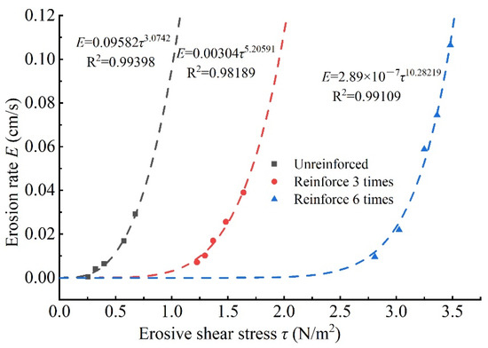 The correlation between the erosion rate and shear stress of the unconsolidated sand bed surface is ; similarly, the correlation for the sand bed surface subjected to three cycles of reinforcement is ; while for six cycles of reinforcement, it is . Notably, as the degree of reinforcement increases, the undetermined constant a decreases and n increases.