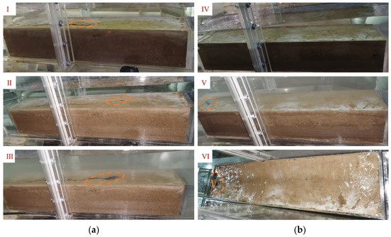 The flow erosion dynamics of the microbial spraying reinforced sand slope model are depicted in Figure 11, where stages I, II, III and IV, V, VI delineate the evolution of flow erosion grooves on the sand surface at various time intervals following three and six rounds of reinforcement, respectively. The results from three applications of microbial slurry reveal that during the initial phase of erosion at a defined flow rate, a small flushing channel along with several impact pits (e.g., I) formed on the surface of the sand box. Fine particles were mobilized from the sand box by water flow; concurrently, larger particles settled within the bedload funnel while fine and micro-sized particles remained suspended in the downstream flume. As water flow velocity increased progressively, cemented sand particles began to lose their shear strength and were systematically eroded; consequently, ongoing soil particle loss resulted in numerous pits developing on the surface (e.g., II), ultimately leading to deep wide gully formation (e.g., III). Under conditions maintaining consistent scouring intensity and duration after six applications of microbial reinforcement, the sand slope exhibited relative flatness without any pit formations; moreover, water clarity within the model was significantly preserved (e.g., IV). With further increases in water flow speed, a minor impact crater (e.g., V) first manifested near the edge of the sandbox amidst downstream flows. As water velocity continued to rise slightly, affecting this crater’s dimensions, overall structural integrity remained intact, with no significant erosive damage observed (e.g., VI).