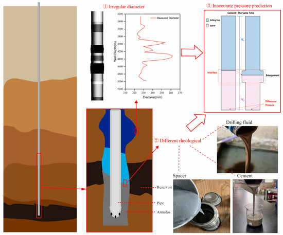To ensure the safety of cementing operations in well cementing, four-string or five-string casing designs and open-hole completion are currently in use. This also puts forward higher requirements for the accuracy of wellbore pressure prediction and control results during cementing. Existing studies on cementing ECD (Equivalent Circulating Density) mainly focus on quantifying the influence rules of downhole high temperature and high pressure on wellbore fluid rheology based on experiments to improve the accuracy of the model calculation. Some researchers have conducted an experimental study on the rheology of water-based drilling fluids under high temperature and high pressure using the Fann high-temperature, high-pressure viscometer and conducted a qualitative analysis [6]. Another author proposed a comprehensive model for predicting the shape viscosity, yield value, and apparent viscosity by synthesizing multiple published models [7]. Other authors conducted an in-depth study on the influence of pressure on the yield stress, apparent viscosity, and fluidity index of water-based drilling fluids based on the high-temperature, high-pressure rheometer [8]. Researchers enhanced the prediction accuracy and further broadened the application range of the prediction model by using a non-parametric nonlinear regression model to fit the experimental data [9]. Other researchers have explored how the eccentricity of annuli significantly affects the velocity profile and frictional pressure losses in extended-reach wells and slimholes [10]. Authors developed a numerical model to simulate the laminar flow of yield-power-law fluids in eccentric annular geometries, which has an excellent agreement for the case of non-Newtonian fluids [11]. For ECD calculation models, the parameters that most significantly affect the precision of the results are the flow rate, fluid rheology, fluid density, wellbore diameter, and eccentricity. The aforementioned calculation models and commercial software all evolved from the classical drilling ECD calculation model framework, focusing mostly on the variations in flow rate, rheology [12,13,14], and density [15]; however, the wellbore diameter and eccentricity are typically calculated using fixed values throughout, which, ignoring the variations in wellbore diameter and eccentricity, would lead to discrepancies between the calculated results and field-measured values [16], as shown in Figure 1.