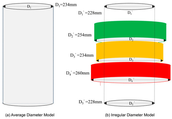 Research has taken a directional well 7X27x2 in an oilfield in Eastern China as an example, and the well depth is 4980 m, the three-opening drill bit size is 215.9 mm, and the outer diameter of the casing is 139.7 mm. Based on the barehole section of the well logging data, this paper calculated parameters of average wellbore model and an irregular wellbore model which are shown in Figure 2. Among them, multifacetedly considering the comprehensive algorithm structure and computation time, the irregular wellbore model adopts a five-layer wellbore model with each layer’s wellbore diameter being the average measured diameter of that section. The comparison of wellbore diameters between the two models is shown in Figure 3.