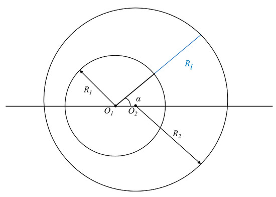 In field cementing operations, the annulus below the wellbore is often eccentric, with the downhole fluid flowing through the eccentric annulus [11]. An eccentric annular flow model is established, where the inner and outer radii of the annulus are R1 and R2, respectively, with the center of the inner circle being O1 and the outer circle being O2, as shown in Figure 7. By establishing a polar coordinate system (α, r) with the center of the inner circle as the origin and the radius direction as the ray, the calculation Formula (10) for the annular gap Ri can be obtained.