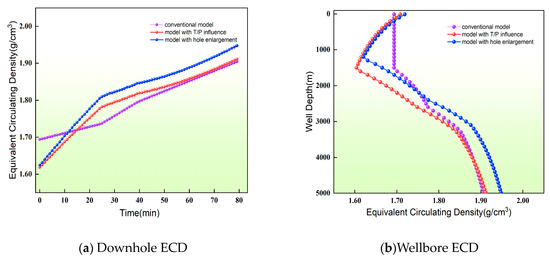 The bottomhole ECD and total well ECD can be calculated using calculation models that consider conventional, coupled temperature–pressure and irregular wellbore diameter factors, respectively. The calculation results are shown in Figure 8. In the figure, compared with the conventional model and the model that only considers temperature and pressure, the new model’s calculation results consider the temperature, pressure, and radius changes. They can more accurately calculate the change in the displacement interface position caused by the irregular wellbore.