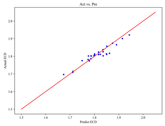 We suggest the readers to refer to the previous analysis path to quantitatively analyze the factors affecting the minimum ECD. The R2 for the minimum ECD model is 0.9982, with an MSE of 1.48 × 10−5. The predictive results of the test set compared with the actual values are shown in Figure 12, indicating a good fit for the model. The significance of the factors is presented in Table 7 and Figure 13. The results reveal that the most significant factors affecting the minimum ECD in the annulus are the drilling fluid density and the consideration of high-temperature, high-pressure fluid properties. The secondary factors include flow rate and the consideration of wellbore irregularity, while the density of the spacer, cement slurry, and eccentricity are non-significant.