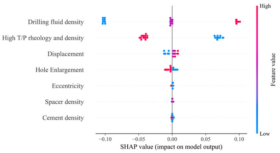 In addition, the positive and negative impacts of factors on ECD need to be analyzed. SHAP (SHapley Additive exPlanations) is an interpretable model inspired by the Shapley value and represents additive explanations. It quantifies the impact of each factor on the prediction outcome. By utilizing the SHAP model for in-depth data analysis, the output value for an individual sample is 0.0793, and the influence of sample factors is shown in Figure 11. This figure shows the impact of each sample’s features on the model’s prediction results. The horizontal axis is the SHAP value, and the vertical axis is the actual value of the feature. The redder the color, the higher the positive impact the feature has on the prediction results, and the bluer the color, the higher the negative impact. Meanwhile, the wider the color area on the horizontal axis, the greater the impact of the feature value on the result. The figure reveals that the flow rate, density of the drilling fluid, spacer, cement slurry, and consideration of wellbore enlargement are positively correlated with the maximum ECD result, while eccentricity and the consideration of high-temperature high-pressure fluid properties are negatively correlated with the outcome.