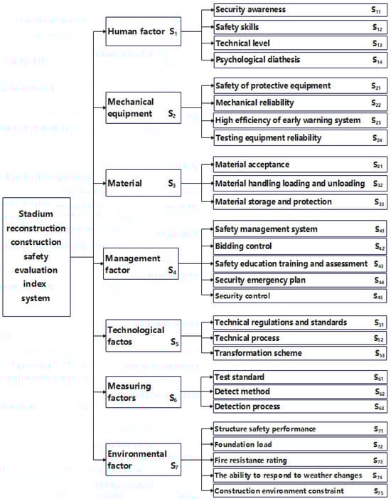 This study is based on the reference to “General code for maintenance and renovation of existing buildings”, “Design code for sports building”, “Construction enterprise safety assessment standards”, “General requirements of public safety and security for stadium and sports hall” [,,,], and other relevant standards, regulations, and literature. The 5M1E theory [] was used to perform the primary selection of the safety evaluation index of stadium reconstruction construction. The theory of 5M1E is based on the six management elements of man, machine, material, method, measurement, and environment. Based on the actual situation of the renovation project, the method was divided into two parts: technical scheme and management measures. Based on this, a safety evaluation index system for stadium reconstruction was constructed in a preliminary manner.