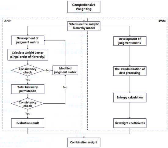 There are two main methods for determining weight: the subjective and objective weighting methods. The subjective weighting method considers the subjective importance of decision-makers on each evaluation index, such as the analytic hierarchy process (AHP), optimal sequence diagram method, and link score method. The objective weighting method is mainly based on the correlation and degree of variation of the evaluation index itself, such as the entropy weight method, factor analysis method, information weight method, and other methods to determine the weight. Although the subjective weighting method can fully consider the subjective judgment of decision-makers, it relies too much on the subjective judgment of decision-makers, which may lead to an unreasonable weight distribution. Although an objective weighting method can avoid interference from subjective factors, it may be affected by random errors in the sample, resulting in an inaccurate weight distribution. Therefore, a single-weighting method cannot yield satisfactory results.