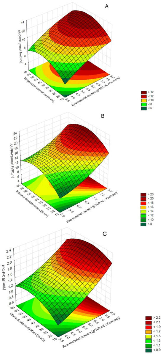 Figure 1B, showing the relationship between the plant material content and ethanol concentration and antioxidant activity (AA-FRAP) using the FRAP method, shows that during a 10 min extraction run using 4.7 g/100 mL of solvent of plant material and an ethanol concentration of 48% v/v, the extremum of the function under study is reached as a minimum. In the area of input conditions, the FRAP antioxidant activity function describing the extraction process increases monotonically with respect to the raw material content (from <8 to >20 mmol FeSO4/L) for a constant extraction time of 10 min. During a 10 min extraction run, the highest value of the function under study (i.e., >20 mmol FeSO4/L) is achieved using the maximum amount of plant material (i.e., ≥7.5 g/100 mL of solvent), while the use of lower amounts of plant material (i.e., less than 7.5 g/100 mL of solvent) results in a decrease in AA-FRAP (Figure 1B).