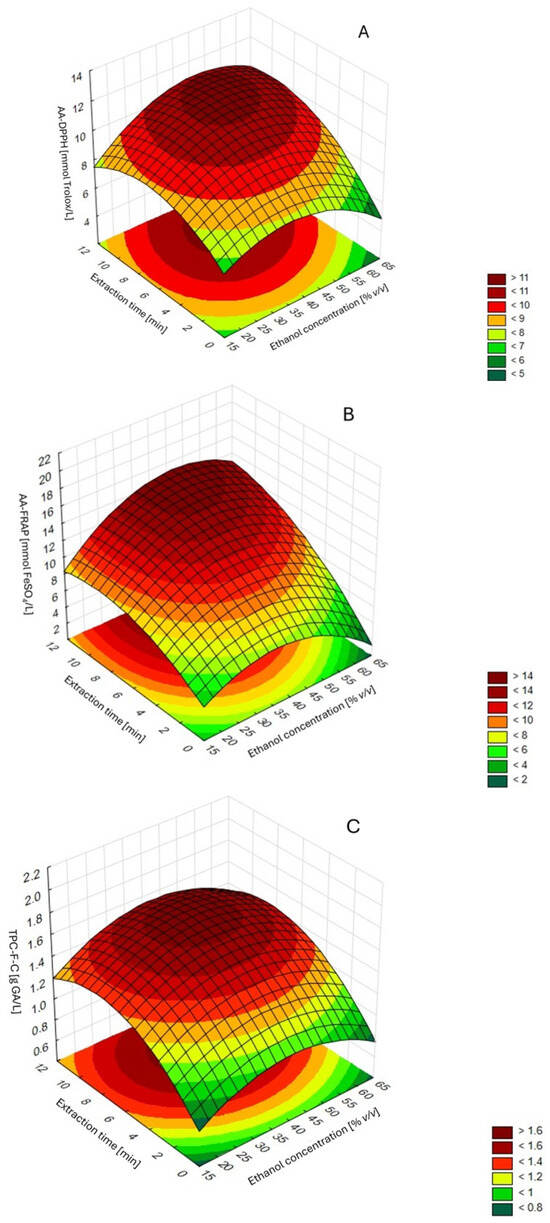 Figure 2B, showing the relationship between the ethanol concentration and extraction time, shows that for an ethanol concentration of 48% v/v and an extraction time ranging from about 9 to about 14 min (at a plant material content of 7.5 g/100 mL of solvent), the highest antioxidant activity by the FRAP method is achieved (i.e., above 14 mmol FeSO4/L). Reducing the extraction time (below 9 min) or increasing the extraction time (above 14 min) results in lower AA-FRAP values (below 14 mmol FeSO4/L. Extending the extraction time positively affects the antioxidant activity of the extract only during a certain time interval, i.e., until the equilibrium state of concentrations of extracted components inside and outside the plant material is established. After this time, prolonging the extraction (more than 14 min) does not affect the activity of FRAP, causing secondary changes in the composition of the extract—Figure 2B.