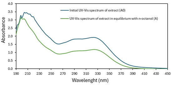 The logarithm of the partition coefficient (log P) n-octanol/water was determined by a spectrophotometric method by carrying out analyses with the Thermo Scientific GENESYS 50 apparatus (Thermo Fisher Scientific, Norristown, PA, USA). The log P was determined for the sum of active compounds having absorbances in the wavelength range of 190–450 nm. Based on the mass balance and the assumption that Lambert–Beer’s law is satisfied in the studied wavelength range (190–450 nm), the concentration ratio of the compounds in the extract was determined, as illustrated by Equation (4):