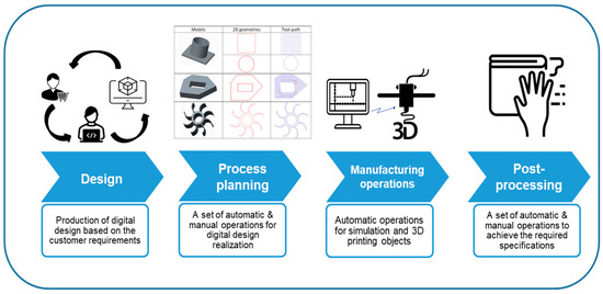 Similar to most additive manufacturing technologies, the creation of a final product through 3D food printing unfolds across four distinct stages: Design, process planning, manufacturing operations, and post-processing, as outlined and illustrated in Figure 1 below.