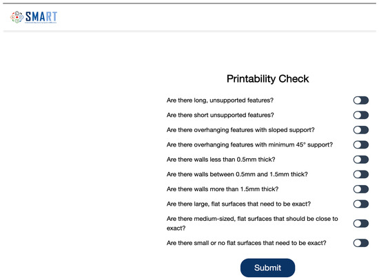 The process is initiated with the computational model, which is defined by the constraints of the printers in the system, setting the threshold values for the nozzle diameter (representing the ability to manufacture the width of the thinnest wall of the design) for each selected machine. These threshold values are critical since they determine the capability of each printer to handle the thinnest wall design feature. For example, if the width of thinnest wall in each design is 0.5 mm, both the Foodini by Natural Machines (Madrid, Spain) and Mmuse by Mmuse Ltd. (China) printers are not capable of manufacturing the design successfully. Therefore, the algorithm will test the design on the Foodbot S2 Multi Ingredient only. After setting up the nozzle diameter, the algorithm will interact with the user through a series of specific questions designed to collect the user input and comprehensively review the design’s features, as shown in Figure 2 below. The developed method employs a set of algorithms to evaluate the printability of the product by assessing the 3D design based on the DfAM design guidelines. Moreover, the evaluation is conducted in a virtual environment that could be integrated into the slicing software, providing a real-time evaluation of the design. The integration of the proposed workflow into the design enhancement method adds significant value to this system. Once the analysis is completed, the method determines the design printability score