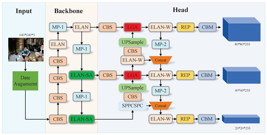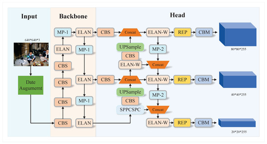 The YOLOv7 Backbone network consists of three main components, CBS, MP-1, and ELAN, as illustrated in Figure 2. The CBS module includes convolutional layers [19] and batch normalization layers, along with the implementation of the SiLU activation function [20]. The ELAN module is essential for feature extraction within the Backbone. It employs an efficient network structure that optimizes both short and long gradient paths, enabling the model to learn a broader spectrum of features and enhance robustness. ELAN operates through two branches: the first focuses on channel adjustment using a 1 × 1 convolution, whereas the second branch is more complex. It begins with a 1 × 1 convolution to modify the channels, followed by four 3 × 3 convolutional layers specifically designed for feature extraction.