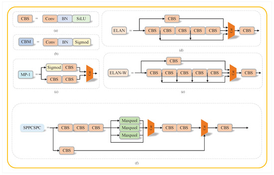 The various modules of the YOLOv7 Network. (a) Composition of the CBS Module. (b) Composition of the CBM Module. (c) Composition of the MP-1 Module. (d) Composition of the ELAN Module. (e) Composition of the ELAN-W Module. (f) Composition of the SPPCSPC Module.