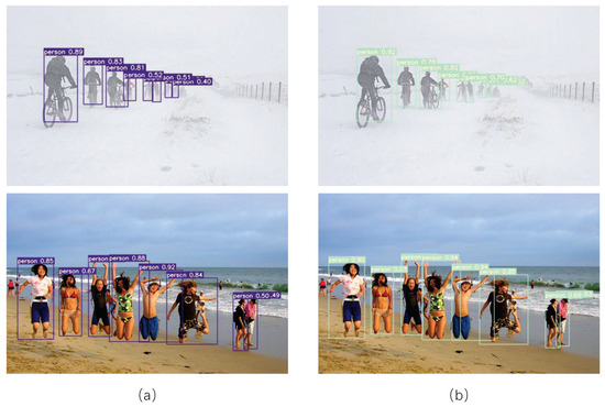 Comparison of detection results between YOLOv7 and YOLO-ESL. (a) Detection results of YOLOv7. (b) Detection results of YOLO-ESL.