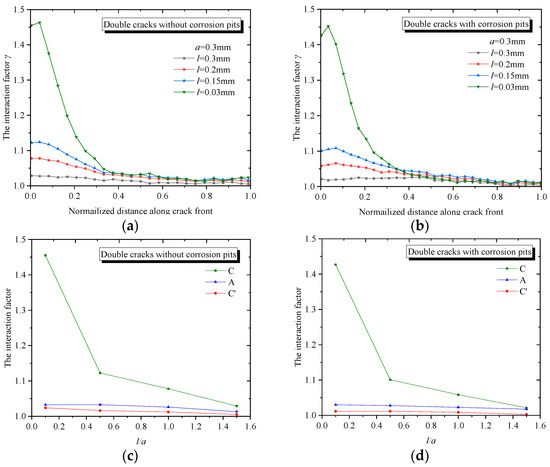 In order to obtain a more comprehensive analysis result, the influence of interaction factors was examined by setting different geometrically shaped initial cracks and crack tip distances. With the crack depth set to a = 0.3 mm, Figure 14a,b illustrates the variation trend of the interaction factor γ for different relative positions of crack fronts under two scenarios. It can be observed that the interaction factor γ for both the combination of cracks with and without corrosion pits exhibits a similar variation trend. Due to the interaction between adjacent crack tips, the cracks tend to coalesce, resulting in the interaction factor γ reaching a peak near the inner crack tip C and gradually decreasing after moving away from the interaction region. Meanwhile, corrosion pits have a certain amplifying effect on the interaction factor at the crack tips.