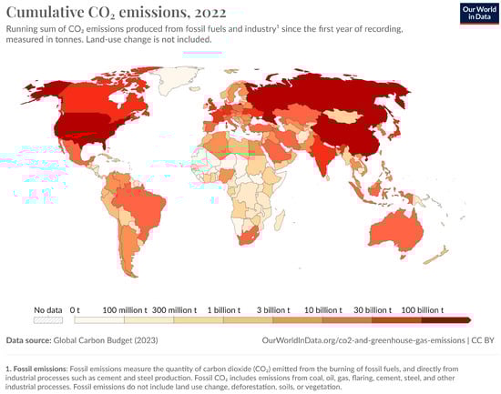 - Ritchie, H.; Rosado, P.; Roser, M. Data Page: Cumulative CO2 Emissions. 2023. Available online: https://ourworldindata.org/grapher/cumulative-co-emissions (accessed on 14 October 2024).