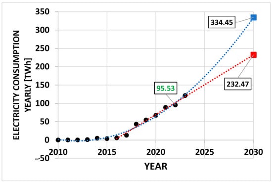 Plots of the linear (dashed red dots) and nonlinear regression (dashed blue dots) models and the corresponding extrapolated predictions for 2030 (red and blue squares). Energy consumption data are taken from ref. []. The 2022 value of 95.53 TWh is also highlighted. Data and models are reported as Table S12.