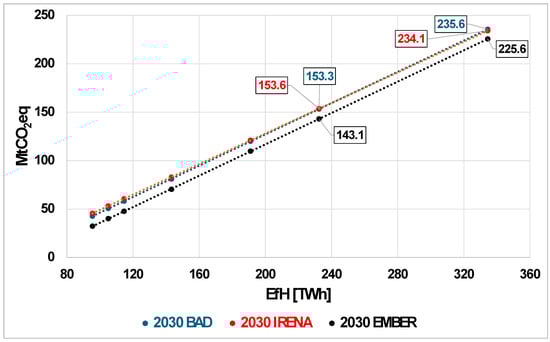 - While the carbon emission projections to 2030, extrapolating values of EfH (see Figure 4), are estimated within the range 117.03–331.90 Mt CO2 provided by Shi et al. [] in their PoW carbon projection logistic model, only values of the 2030 BAD and 2030 IRENA scenarios for an EfH value increased by +100% (120.0 Mt CO2 and 121.0 Mt CO2, respectively, see Figure 3), remain within such a range.