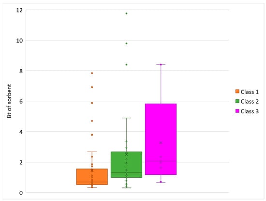 In the framework of the carbon capture technologies, we focused on the largely employed amine-based sorbents [,,,,,,]. To this aim, we referred to the work published by Leonzio et al. (2022) [], which reports the adsorption capacity values (expressed in mol CO2/kg of sorbent) of Class I, II and III amine-functionalized sorbents.