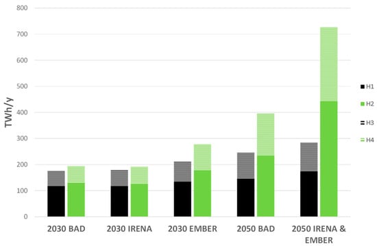 According to Equations (1)–(4), the BEE electricity associated with the four hypotheses (i.e., H1–H4) is depicted in Figure 6. The calculation of the BEE allowed for the estimation of the limit values of electricity consumption for which the reduction in the carbon intensity of the energy mix of the involved nations would be a trade-off. In Figure 6, the black solid-fill bars indicate the electrical consumption achievable, assuming that the percentages of LCE and HCE remain constant for each specific scenario (H1). In contrast, the green solid-fill bars show the electrical consumption achievable, assuming that the excess electricity is entirely derived from HCE (H2). The dashed bars indicate the two already shown hypotheses (H1 and H2) but with additional electrical consumption achievable by introducing the credit associated with the recovered heat into the model (black and green dashed bars H3 and H4). The consumption limit observed for the H1 and H2 hypotheses grows, driven by increasing LCE percentages in the mixes; for this reason, an increase in the limit is observed over time. According to Figure 6, the window of 2030 ranges from 117.9 TWh to 130.6 TWh in the BAD scenario, from 117.3 TWh to 124.8 TWh in the IRENA scenario and from 135.2 TWh to 178.1 TWh in the EMBER scenario. Regarding 2050, the limits range from 146.3 TWh to 235.1 TWh in the BAD scenario and from 172.9 TWh to 442.4 TWh in the IRENA and EMBER scenario. The BEE calculated assumed to recover the heat generated during the mining processes (Sections Hypothesis 3 (H3) and Hypothesis 4 (H4)) extends the ranges between 175.3 and 194.1 TWh in the 2030 BAD scenario, 179.1 and 190.7 TWh in the 2030 IRENA scenario, 211.1 and 278.0 TWh in the 2030 EMBER scenario, 246.1 and 395.5 TWh in the BAD 2050 scenario, and 284.4 and 727.4 TWh in the 2050 IRENA and EMBER scenario.