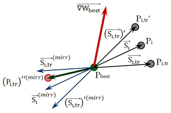 However, if the JAYA-based repair strategy fails and it still holds that W(()′) > 1.1W(), FHGWJA has to deal with three solutions, , , and , that do not improve the current best record . Figure 1 shows the mutual positions of the cost function gradient evaluated at the current best record and the non-descent directions , , and ; Pbest is the point of the search space corresponding to the current best record while the Pi, Pi,tr, and Pi,tr′ points, respectively, correspond to trial solutions , , and . It can be seen from Figure 1 that non-descent directions make positive scalar products with the gradient . Design may be improved with respect to by moving on the descent directions , , and that are, respectively, opposite to the non-descent directions , , and and hence make negative scalar products with respect to (see Figure 1). Hence, FHGWJA uses a “mirroring” strategy to define the new trial solution as follows: