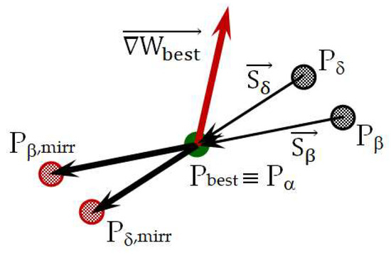 The mirror strategy used in FHGWJA is illustrated in Figure 2. In particular, the figure shows the following: (i) the original positions of wolves α, β, and δ, respectively, correspond to points Popt≡Pα, Pβ, and Pδ of the search space; (ii) the positions of “mirror” wolves βmirr and δmirr are defined with Equation (16) and, respectively, correspond to points Pβ,mirr and Pδ,mirr of the search space; (iii) the cost function gradient vector is evaluated at . It can be seen that the “mirror” wolves βmirr and δmirr defined by Equation (16) lie on descent directions and may even improve , the position of wolf α. In fact, it holds that and , where “×” denotes the scalar product between two vectors. Interestingly, since is in principle a steeper descent direction than as Wp() > Wp() > Wp(), wolf δ may have a higher probability than wolf β to replace wolf α even though it originally occupied a worse position than wolf β in the search space. This elitist approach forces FHGWJA to carry out a new exploration of the search space rather than trying to exploit solutions that have not improved the design in the last iteration. Furthermore, by eliminating the two worst designs of the population, FHGWJA increases the average quality of candidate solutions and achieves a higher probability of generating high-quality trial solutions in the next iteration.