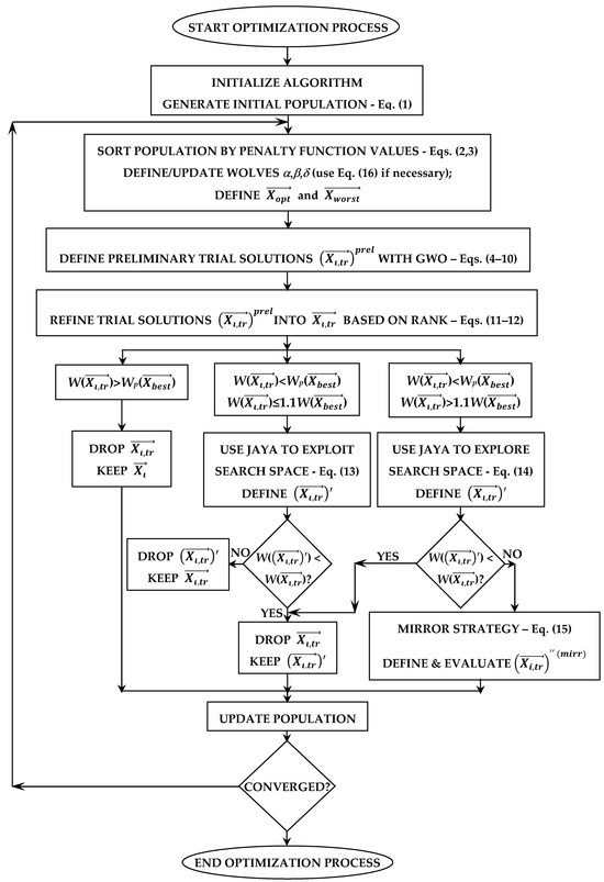 Figure 3 shows the flow chart of the novel FHGWJA algorithm developed in this study. The present algorithm actually is an advanced grey wolf optimizer, which updates population taking care that the α, β, and δ wolves effectively lead to improve the current best record in each iteration. The JAYA schemes and the elitist strategies implemented in FHGWJA enhance exploration and exploitation forcing the present algorithm to increase diversity and select high-quality trial designs without performing too many function evaluations. The definition of all descent directions utilized in FHGWJA in the optimization search does not entail any new constraint evaluation, and all decisions are made in FHGWJA by comparing only cost function values. Interestingly, FHGWJA does not need any new internal parameters with respect to the classical GWO and JAYA formulations that require users to specify population size NPOP and limit number of iterations Nitermax. This feature of FHGWJA is not very common as simple hybrid metaheuristic algorithms may adopt a set of new heuristic parameters to switch from one component optimizer to the other. However, FHGWJA implements a master–slave algorithmic architecture where the slave algorithm, JAYA, is utilized only to refine or correct the trial designs generated by the master algorithm, GWO.