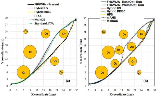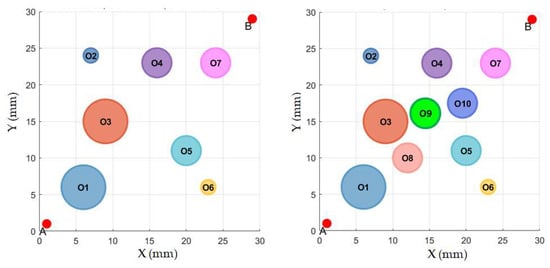 Figure 4 shows the design space of the two path planning problems (all coordinates are expressed in mm) solved in this study considering the presence of 7 or 10 obstacles and the same number of base points. In the former case, there are the start/end points A(1,1) and B(29,29) mm to be connected and the seven obstacles, O1(6,6), O2(7,24), O3(9,15), O4(16,23), O5(20,11), O6(23,6), and O7(24,23) mm, limiting circular areas of radii 3, 1, 3, 2, 2, 1, and 2 mm, respectively. The optimization problem hence includes 14 variables corresponding to the coordinates of base points (i.e., 2.NBP = 2 × 7) that can vary between 1 and 29 mm, NOB = 7 obstacles, NCP = 100 control points, and 749 nonlinear constraints (i.e., (NCP+NBP)× NOB = (100 + 7)× 7 = 749).