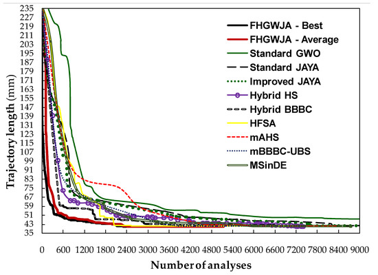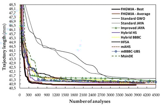 For both problem variants, the FHGWJA hybrid optimizer developed here was compared with the best optimizers quoted in the literature: namely, hybrid harmony search (hybrid HS), hybrid big bang–big crunch (hybrid BBBC), and hybrid fast simulated annealing (HFSA) [81]. Such a comparison should be considered highly indicative because the hybrid optimizers developed in [81] combined efficient metaheuristic search engines with approximate line search strategies and gradient information while FHGWJA repeatedly utilizes elitist strategies based on the concept of descent direction. The classical grey wolf optimizer (GWO) and the classical and improved JAYA formulations [81] also were compared with FHGWJA to prove the advantages of the hybrid optimizer. Finally, modified harmony search optimization with adaptive parameter updating (mAHS) (derived from the AHS algorithm of Ref. [94]), modified big bang–big crunch with upper bound strategy (mBBBC–UBS) (derived from the BBBC–UBS algorithm of Ref. [95]), and modified sinusoidal differential evolution (MsinDE) (derived from the sinDE algorithm of Ref. [96]) were enhanced with the W() ≤ 1.1W() elitist strategy of FHGWJA to gather specific information on the efficiency of this strategy.