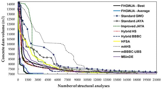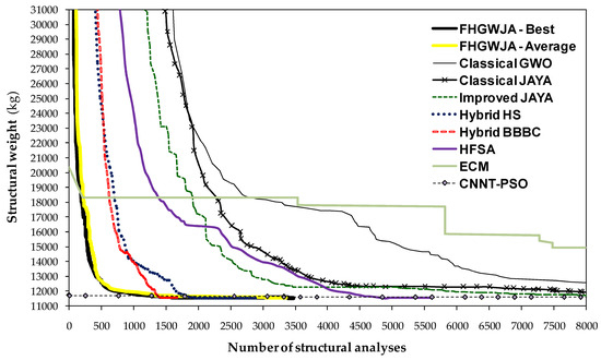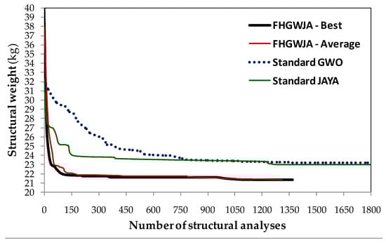 The computational cost of most GWO/JAYA implementations documented in the literature was NPOP × Nitermax function evaluations (also indicated as function calls or analyses for general problems or structural analyses for structural optimization problems) including constraint evaluations. The FHGWJA’s ability of generating high-quality trial solutions throughout the optimization process significantly reduces the computational cost of the optimization. As far as population size NPOP, it is well known that increasing NPOP in metaheuristic optimization may enhance exploration capabilities but also results in a very large number of function evaluations. Indeed, it is not necessary to work with a large population if the search engine can always generate high-quality designs that improve the current best record or the currently perturbed search agents such as is accomplished with FHGWJA. It should be noted that grey wolves hunt in nature in groups comprising, at most, 10–20 individuals (the typical family pack is formed by 5–11 animals but in some cases the pack can be formed by 2–3 families). In view of this, FHGWJA optimizations carried out in this study utilized a population of 10 individuals. Sensitivity analysis confirmed the validity of this setting.