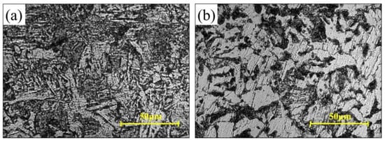The chemical compositions of G20Mn5QT and the weld wire were determined and are given in Table 1. The microstructures of the G20Mn5QT cast steel and butt welds were observed via an optical microscope and are presented in Figure 1. G20Mn5QT cast steel, as a low alloy and low-carbon (LALC) cast steel, was found in its tempered sorbite form for the observation of clumpy and needle-like ferrite, as shown in Figure 1a. In addition, fine dispersed carbides were distributed discontinuously along the grain boundaries and in the grain interior. The microstructures of the weld zone could be categorized as a homogeneous ferrite–pearlite structure with Widmanstätten patterns involving coarse grains of the ferritic phase and a number of oxide inclusions, as shown in Figure 1b.