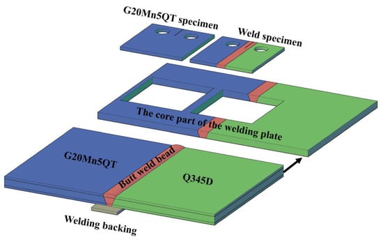 A 20 mm thick welding plate consisting of G20Mn5QT and Q345D was employed in this study. The butt weld with V groove is fabricated via CO2 gas arc welding. The filler material was an ER50-6 wire with a diameter of 1.2 mm. During the welding process, the pre-heating temperature was controlled to be 150 °C, the weld inter-pass temperature was controlled to be 200–250 °C, and the post-heating temperature was controlled to be 250 °C for approximately two hours.
