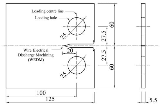 All the compact tension (CT) specimens used in the tests were machined from the core material of the welding plate, as shown in Figure 2. The specimens used for testing the fatigue crack growth behaviors of G20Mn5QT were machined from an area far from the butt weld to avoid the influence of welding heat. For the specimens used for testing the fatigue crack growth behaviors of the butt weld, the pre-crack was ensured to be in the middle of the weld zone. The geometric specifications of the CT specimens, according to standard ASTM: E647 [40], are shown in Figure 3.