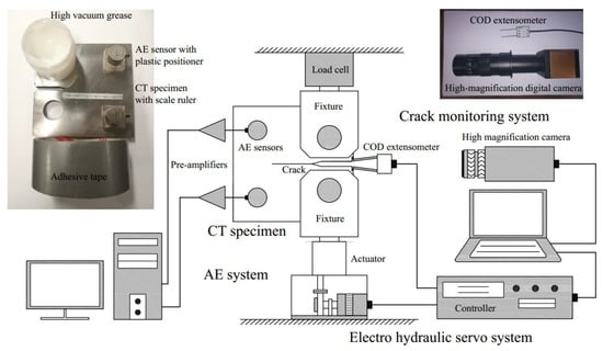 All the specimens were tested on an electrohydraulic servo fatigue testing machine under ambient temperature. The setup of the test is illustrated in Figure 4. The tests were carried out under sinusoidal cyclic loads with a maximum load of 18 kN and a load ratio of 0.5. In this test, the load frequency of 20 Hz was used to prefabricate the fatigue crack, and the load frequency of 4 Hz during the main phase of the fatigue test was applied to facilitate the precise observation of fatigue cracks. The stress intensity factor range ΔK could be calculated via Equation (1) [40].
