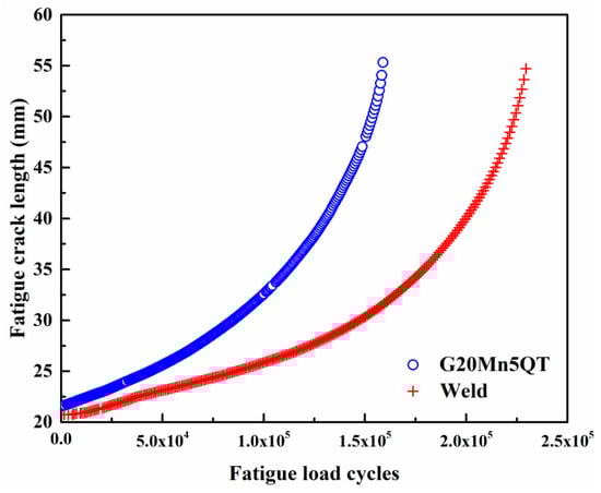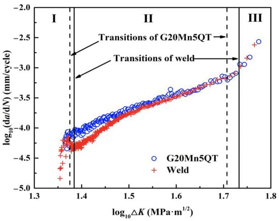 The fatigue crack growth rates of the G20Mn5QT and butt welds were compared. Figure 5 shows the relationship between the fatigue crack length and the fatigue load cycles. Figure 6 shows the relationship between the fatigue crack growth rate da/dN and the stress intensity factor range ΔK. It was noted that compared to the G20Mn5QT, the weld requires a larger number of load cycles to reach the same crack length. The fatigue crack growth rate of the weld is less than that of G20Mn5QT at low values of ΔK; however, the corresponding rates tend to be similar at high values of ΔK. The results obtained by fitting the fatigue crack growth rate curves according to the famous Paris law [42] (see Equation (3)) on double logarithmic coordinates can be represented as in Equation (4) (R2 = 0.97) for G20Mn5QT and Equation (5) (R2 = 0.95) for the weld.