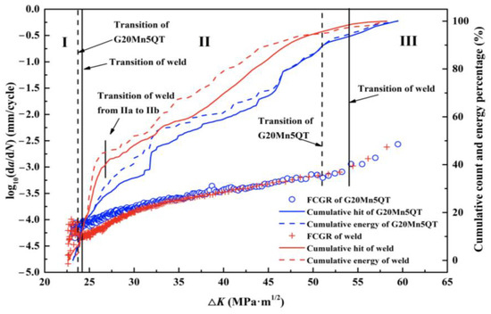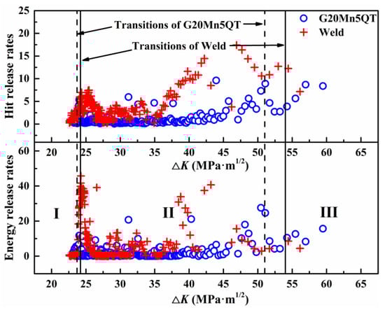 According to the fatigue crack growth rate (FCGR) curves, the fatigue crack growth process can be divided into three stages, as shown in Figure 6. The transition from stage I to stage II pertains to crack initiation progressing to stable crack growth. The transition from stage II to stage III corresponds to the crack demonstrating unstable crack growth. The AE activities of G20Mn5QT and the weld vary considerably at different fatigue crack growth stages. The differences between ΔK, AE hit release rates, and energy release rates for G20Mn5QT and the weld are shown in Figure 7. For G20Mn5QT, the hit and energy release rates reach the first peak at the end of stage I and later decline rapidly. For the weld, the hit and energy release rates also increase in stage I, but they reach the first peak at the boundary between stage I and stage II and decline gradually compared to the corresponding values for the case of G20Mn5QT at the beginning of stage II. In stage II, the AE activity remains stable and relatively low level at first; however, it resumes growth in the middle of stage II as the fatigue crack propagation approaches stage III. The regrowth point for G20Mn5QT appears earlier than it does for the weld. In stage III, the fatigue crack rapidly grows to the point of ultimate failure, and the hit and energy release rates become discrete and unstable.