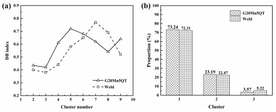 Cluster analysis of G20Mn5QT and weld: (a) DB index; (b) proportion of each cluster.